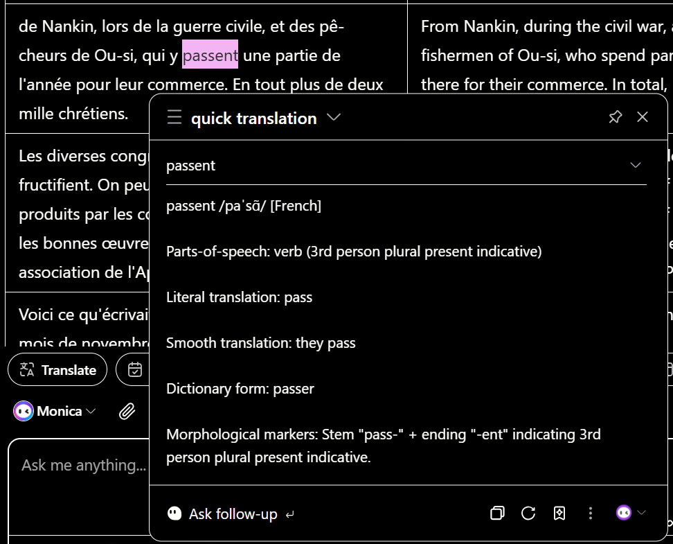 我用的 monica 有個不錯的設計,可以高亮一個字或一段,並完成指定任務,例如度身訂做字典、翻譯、語法說明等等,不必跳到另一版面操作,方便快手,也實在可以學到東西。